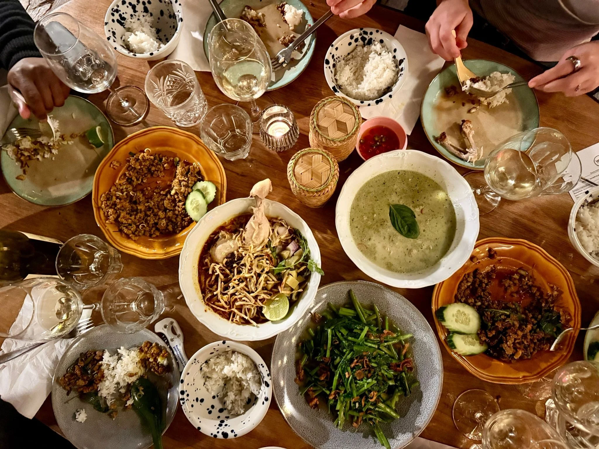 PLATS A PARTAGERTous nos plats et currys sont préparés maison, avec des ingrédients frais Miang Kam 🌶️ 19.– 6 bouchées thaïes aux feuilles de betel. La planchette apéro traditionnelle! Demi-portion 3 pièces: CHF 10.- Som Tam 🌶️ 18.– Salade de papaye verte et cacahuètes torréfiées Tartare de boeuf thaï 🌶️ 21.– Boeuf suisse 140g, échalote, coriandre, menthe, cébette, fish sauce, tamarin, piment, riz gluant torréfié. Chips de crevettes en accompagnement Gai Tod Hat Yai 19.– Ailes de poulet frites de Hat Yai, échalote frite et sauce aigre-douce maison - 10 pièces Demi-portion 5 pièces: CHF 9.5.- Pad Pakboong 19.– Sauté de liserons d'eau, sauce soja et haricots fermentés Allergènes : Gluten NOS CURRYS MAISON ET SPÉCIALITÉS DU CHEF Gaaeng Koew Wan* 🌶️ 22.– Curry vert maison, tofu, lait de coco, aubergines thaïes, basilic thaï Option poulet: CHF 23.- Pad Kaprao 🌶️🌶️ Porc 23.– / Bœuf 25.– Sauté au basilic à la viande haché Allergènes : fish sauce, sauce soja Gaeng Phet Ped 🌶️ 28.– Filet de canard, curry rouge maison, ananas frais, basilic thaï et aubergines thaïes Option végé : Tofu au lieu de canette CHF 22.- Kua Kling 🌶️🌶️🌶️ Porc 23.– / Bœuf 25.– Curry sec du sud maison, feuilles de kéfir et poivre vert thaï Allergènes : pâte de crevettes, fish sauce Lohn Ma 25.– Soupe parfumée aux crevettes et lait de coco, aubergines thaïes et tomates, échalotes et de coriandre SIDES & DESSERTS Khao 3.5.– Riz Jasmin Khao Gnjeaw 5.– Sticky Rice Kai Dao 4.– Œuf au plat Khao Niaw Mamuang 13.– Mango sticky rice Ice Cream Kati 10.– Glace coco maison, cacahouètes torréfiées, jackfruit
